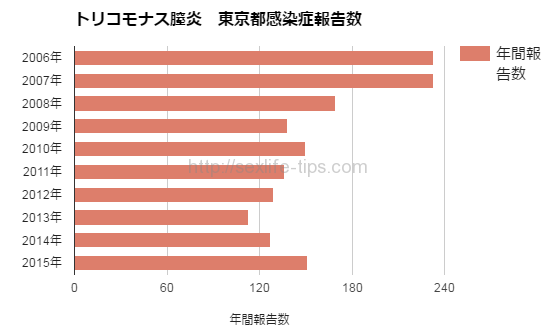 またトリコモナス原虫が膣に寄生して炎症を起こすことからトリコモナス膣炎とも呼ばれています。以下は東京都の保健福祉局のデータをもとに作成したグラフとなります。まずはご覧ください。